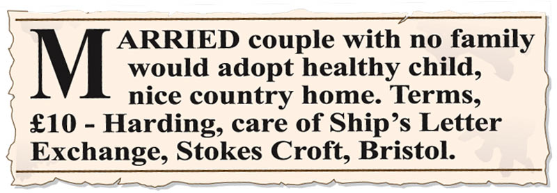 Amelia Dyer, célèbre nourrice tueuse d'enfants, et la petite-annonce par laquelle elle faisait sa publicité dans les quotidiens de l'époque....